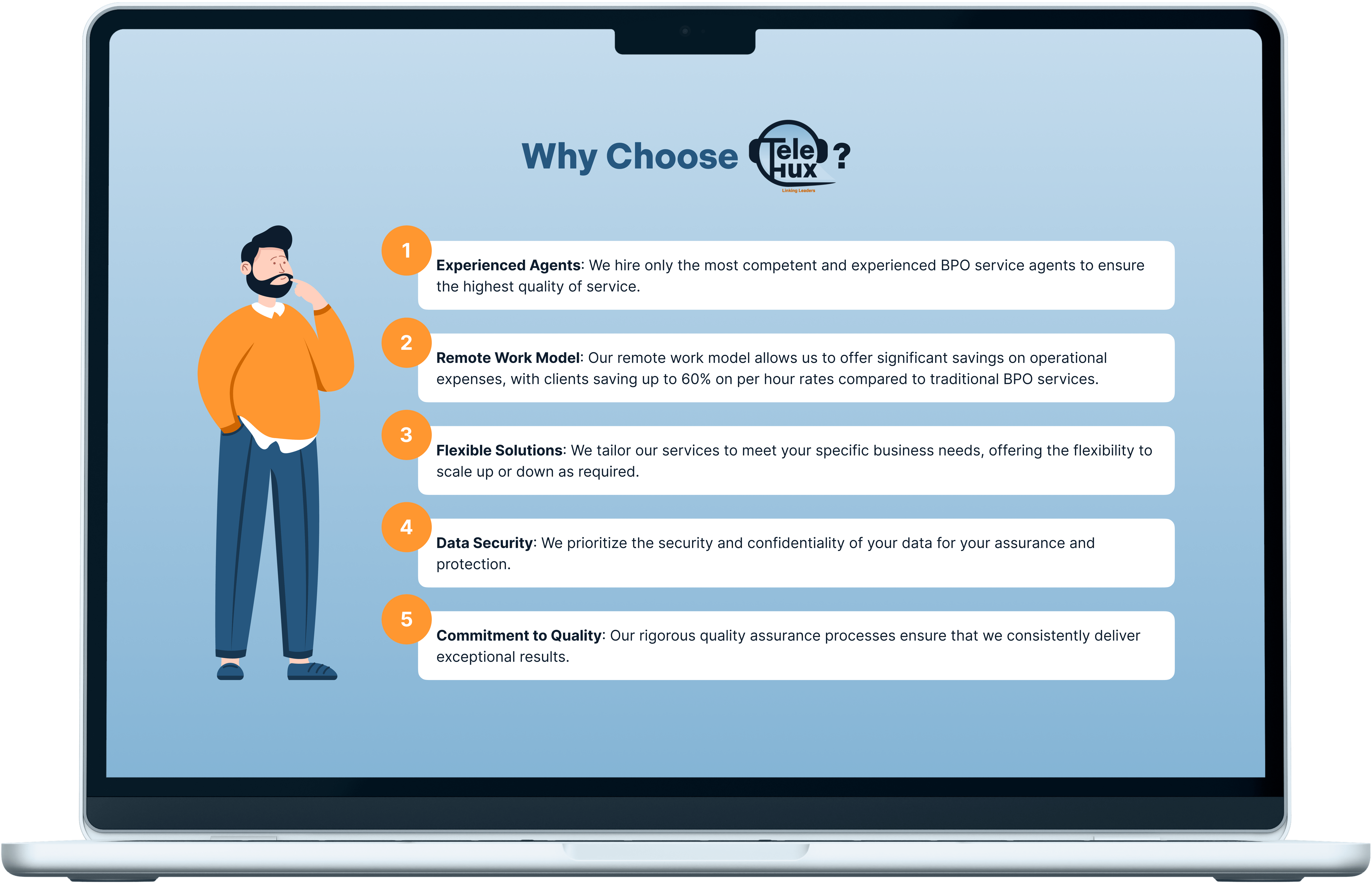 At TeleHux, we are driven by a commitment to continuous improvement and innovation. Our plans to expand our services from other cities in the Philippines reflect our dedication to growing our team with more competent and experienced agents. This expansion will enable us to serve you better and help more businesses achieve their goals.
